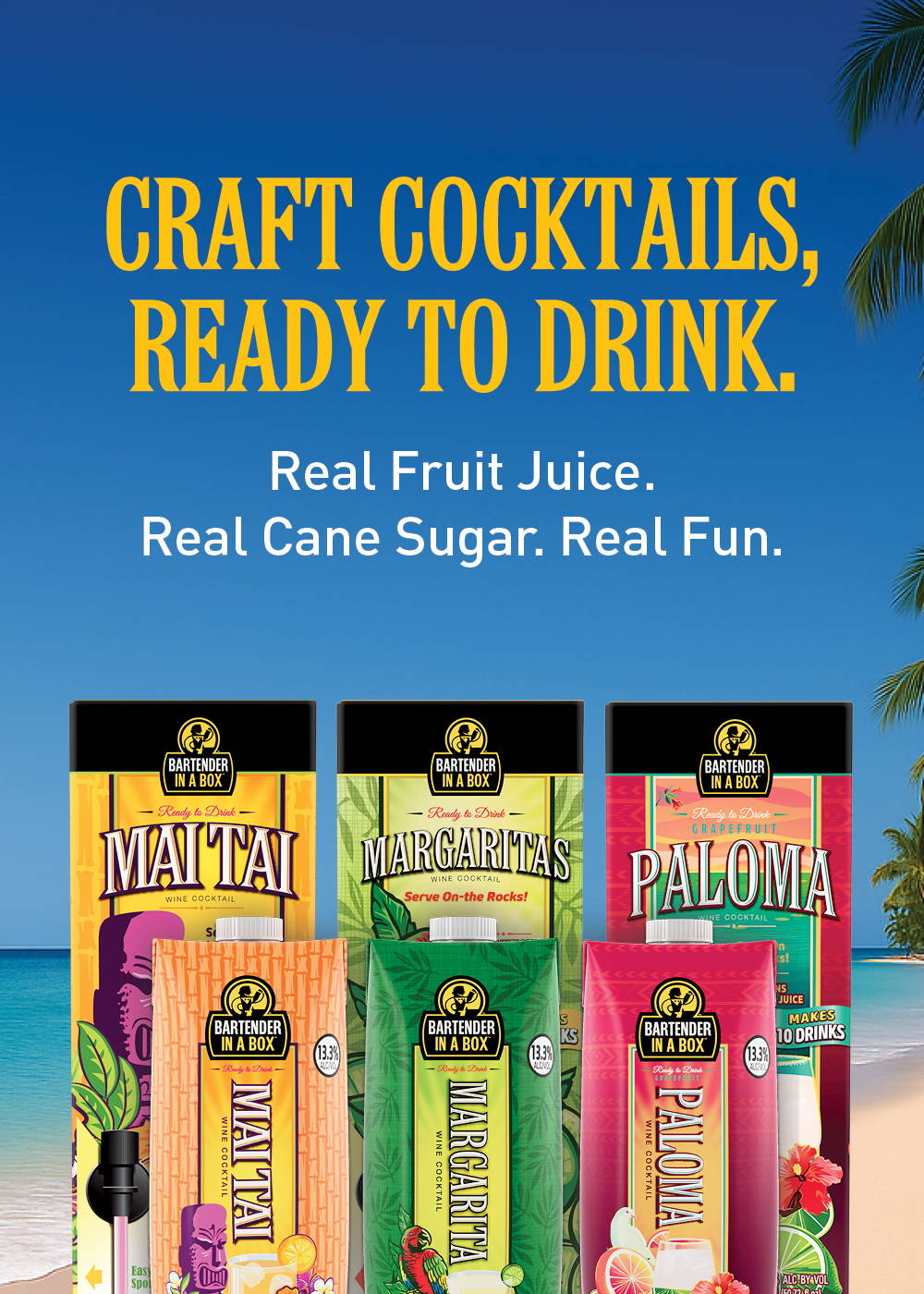 Enjoy the taste of a hand-crafted cocktail without the hassle! Bartender in Box delivers bartender-quality drinks made with Real Fruit Juice & Real Cane Sugar. Flavorful, delicious, and always ready to pour—cheers to convenience!